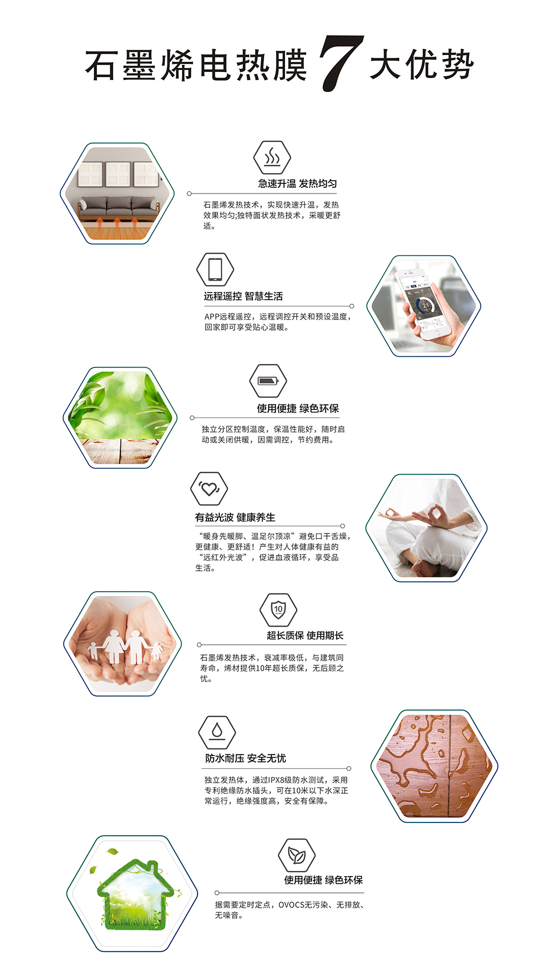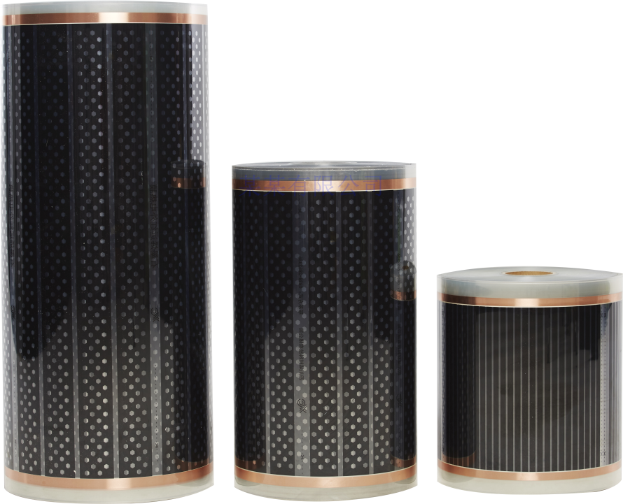 一种通电后即能发热的聚酯薄膜,由石墨烯导电发热油墨、金属载流条、热压在绝缘聚酯薄膜间制成,通电后持续高效的产生远红外线,并向外传递,均匀发热,将大部分热量以辐射形式送入房间,它不单纯加热空气,而是首先加热室内的墙壁、地面、家具等实密物体,然后由这些物体散发辐射热,来自然、均匀的升高室内温度,热转换效率可达99%以上。